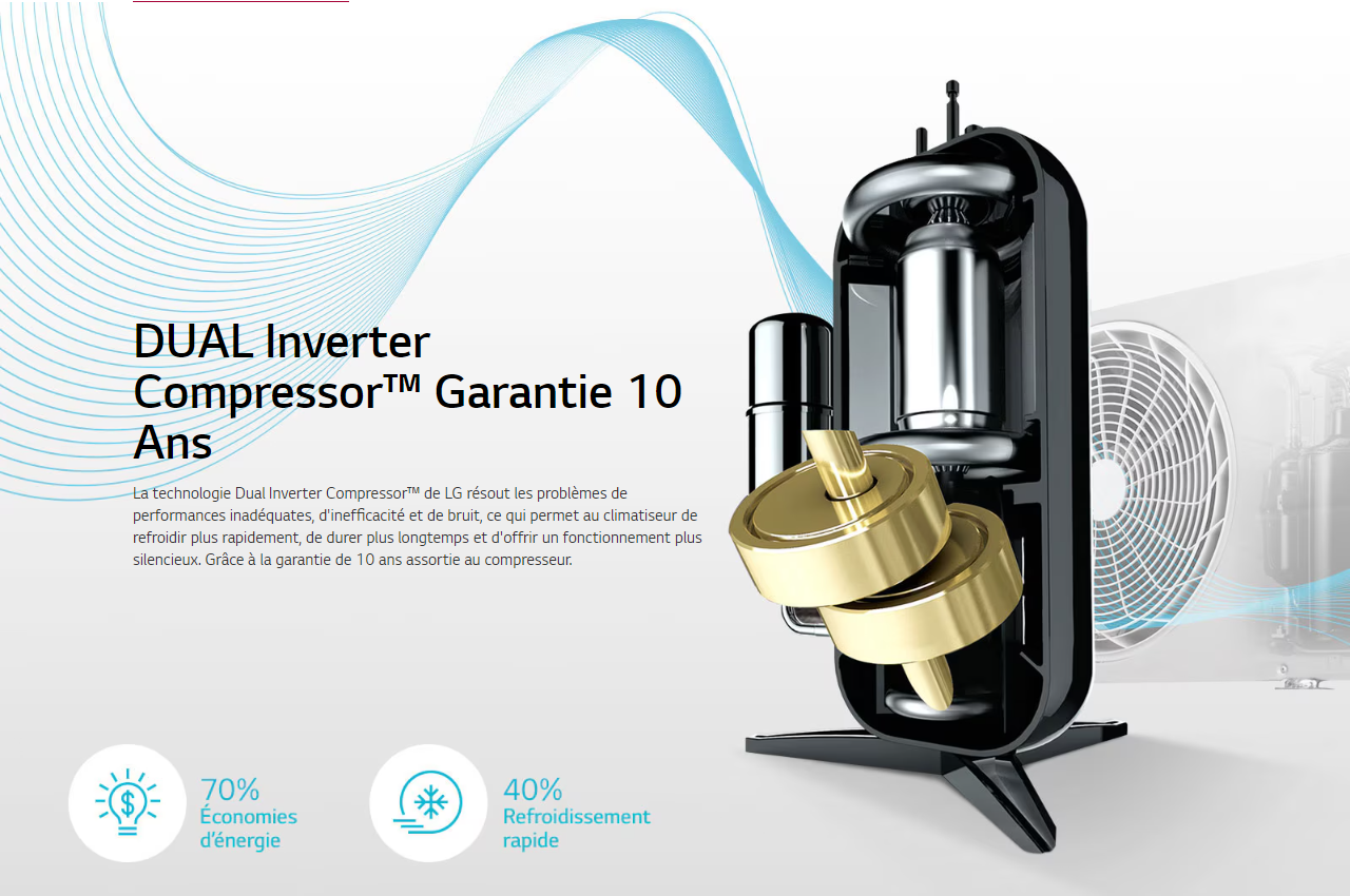 Climatiseur LG Dual Inverter / Capacité: 18000 BTU / Mode: Chaud & Froid / Dual Inverter Compressor / Purification de l'air / Nettoyage automatique / Autodiagnostic / Démarage à chaud/ Plasmaster™Ionizer+ / Filtre anti-allergie / Niveau de bruit: Max. 41 dBA (Intérieur) / Max. 50 dBA (Extérieur) / Économie d’énergie et Refroidissement rapide / Dimensions: 837 x 189 x 302 mm (Intérieur) / 717 x 483 x 230 mm (Extérieur) / Poids: 10.9 kg (Intérieur) / 29.5 kg (Extérieur) / Couleur: Blanc / Garantie 3 ans, Garantie 10 Ans (Compressor)