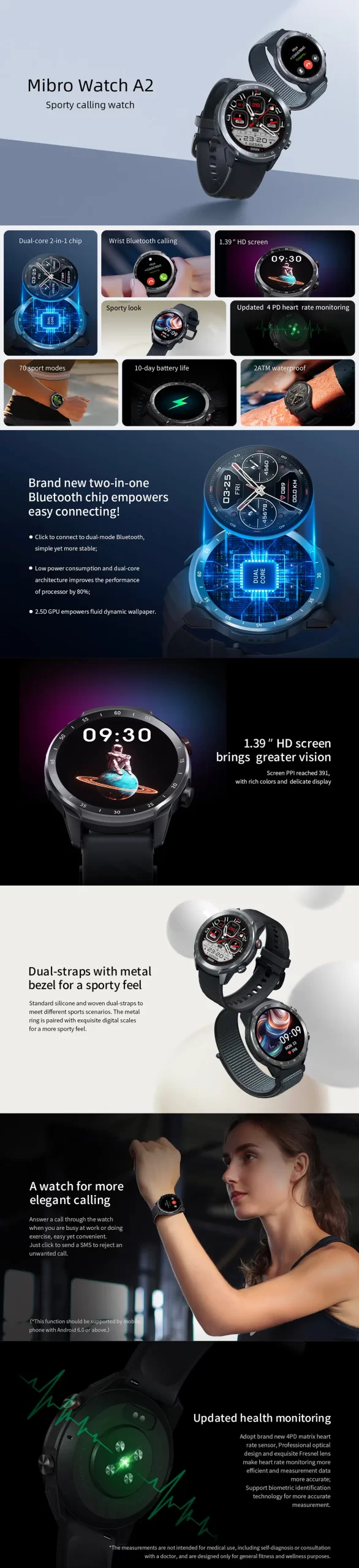 Montre Connectée MIBRO A2 / écran tactile HD 1.39" (360 x 360px) / Connectivité: Bluetooth 5.3 / Processeur: Dual core / Fréquence cardiaque, moniteur d'oxygène sanguin / Appel Bluetooth et notifications ( whatsapp, chat, sms, email..) / Capacité de batterie: 350mah / Autonomie: Mode quotidien 10 jours, Mode de base 50 jours / Look sportif / Mise à jour de la surveillance de la fréquence cardiaque 4 / 70 Modes sport / Charge magnétique / Étanche: 2ATM / Application : MibroFit /Bracelet Silicone / Forme Ronde / Couleur: Noir / Garantie: 1an