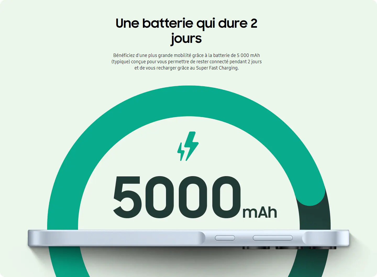 Processeur : Exynos 1380 Octa-core (4x2.4 GHz Cortex-A78 & 4x2.0 GHz Cortex-A55) GPU Mali-G68 MP5 / RAM : 8 Go / Capacité : 128 Go / Ecran 6.6 Super AMOLED, 120 Hz / Résolution : 2340 x 1080 / Appareil photo principal : 50 MP f/1.8, 8MP, 5MP, Caméra Frontale : 13 MP f/2.2 / Wi-Fi / Bluetooth / 5G / GPS / NFC / Bluetooth 5.3, A2DP, LE / Android 14, One UI 6 / Batterie 5000 mAh, Super Charge 25W / Double SIM / Lecteur d'empreinte digitale /Garantie 1an